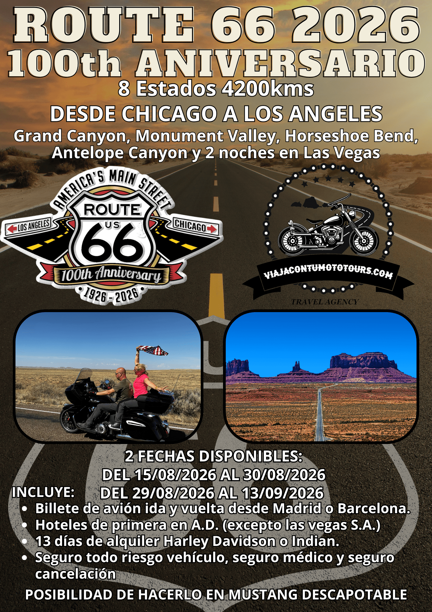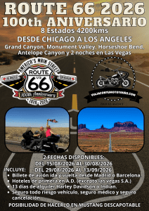 Vive la Ruta 66 en su 100º aniversario recorriendo Estados Unidos de costa a costa. 4.200 km de historia, libertad y paisajes legendarios desde Chicago hasta Los Ángeles, atravesando desiertos, cañones míticos y lugares icónicos como Monument Valley, el Gran Cañón y Las Vegas. El viaje soñado para cualquier motero.